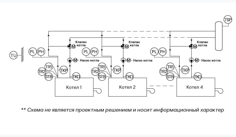 - управление котловыми и сетевыми насосами в соответствии с алгоритмом рабочего режима котлоагрегата;